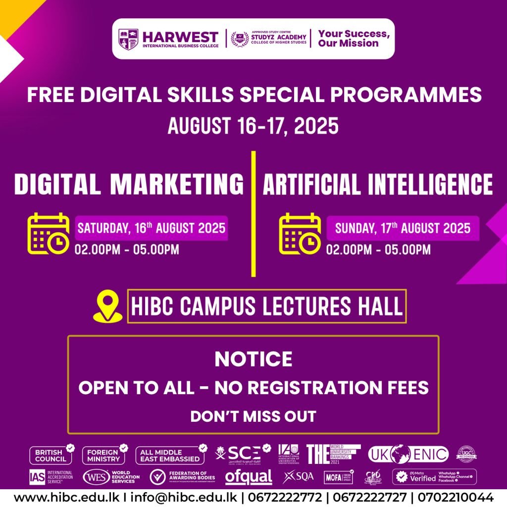 ๐ Free Digital Skills Training โ Open to Everyone! Harwest International Business College (HIBC) is pleased to host two special technology training programmes โ open to all students completely free of charge! ๐ง Digital Marketing Workshop ๐ Date: August 16th (Saturday) ๐ Time: 2:00 PM โ 5:00 PM ๐ค Artificial Intelligence (AI) Workshop ๐ Date: […]